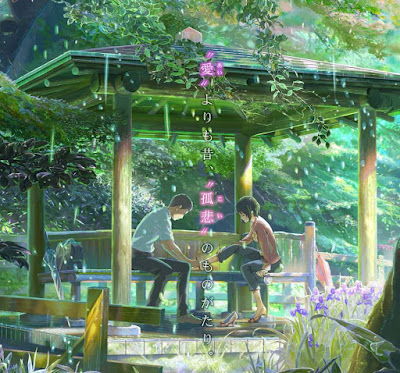 Sinopsis : Takao Akizuki adalah seorang anak SMA yang suka bolos saat hujan. Ia lebih suka mendesain sepatu di bawah gasebo yang berada di sebuah taman. Suatu ketika, dia bertemu dengan seorang wanita tak dikenal bernama Yukino yang lebih tua darinya dan suka makan coklat sambil minum bir. Nampaknya wanita tersebut juga suka bolos. Mereka mulai terbuka satu sama lain dan memperdalam hubungan. Setiap hujan tiba, mereka selalu bertemu di gasebo tersebut. Namun musim hujan telah berakhir, cinta memang tidak memandang usia, apakah mereka akan bertemu kembali?