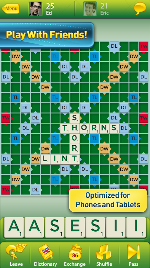 Description: CONNECT WITH FRIENDS. PLAY WITH WORDS. Get a game of SCRABBLE going with just about anyone – or play solo against the computer! For Free!WHO WILL YOU PLAY?