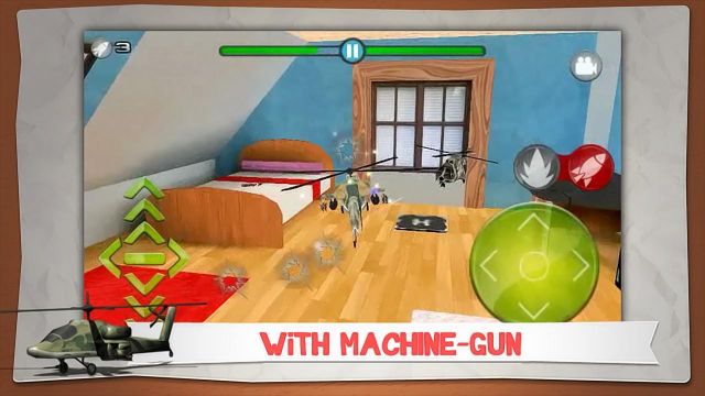 Description: A 3D Radio-Control Helicopter Fighting game in a house. Control a little RC helicopter in different rooms of a house. In front of you, you will fight another RC helicopter, piloted by the AI: dodge rockets, turn on the machine gun and prepare to fight! It is an endless game, divided into levels. Step by step, the difficulty grows up, with the emergence of missile launchers turrets, and a better AI. Go as far as possible, and post you score on the Leader-board, to see your official world ranking! Besides, you have to accomplish 30 objectives during the fight, like shooting down the AI with rockets only, or without loosing one HP... The objectives are translated in 13 languages. Or you can just discover the different rooms using the Free-Flight mode, without opponent: have a good time exploring the environment, and practice your flight.supplied by Harsha