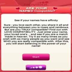 Description: Sure - you love each other, you share it all and everything between you is roses and rainbows. But are you TRULY compatible? Find out with this fun test. Just enter your name, your loved one's... and see if you are a match made in heaven.Try it as many times as you wish with as many people as you want and see WHO you are really compatible with. After this, you will start believing in the power of your name!