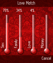 Description: With the help of sophisticated mathematical algorithms Love Match calculates how well you and your partner really fit together. After precise evaluation of both of your names Love Match tells you how well you blend in different areas of life. Love Match is an effective way to evaluate whether your relationship has a chance to last or simply whether the guy next door might be your prince charming.