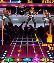 Description: With Guitar Rock Tour, play the guitar parts of rock hits known around the world very easily on your mobile phone...with no musical knowledge necessary! Push the keys on your phone corresponding to the coloured dots scrolling on the screen in rhythm. Get the notes right and you'll hear the sound of the guitar added to the rest of the instruments, giving you the exciting feeling of playing the guitar like a rock god! Jump-start your career as an international rock star by playing in front of adoring audiences in the most prestigious concert halls...but watch out for the wrong notes!