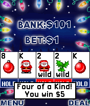 Description: Try your luck on three different Christmas Poker games: "Snowman Poker", "Jacks or Better", and "Deuces Wild". You have $100 to play with, and the three video poker machines to try your luck on: "Jacks or Better", "Deuces Wild", and "Snowman Poker". Choose to bet $1.00 - $5.00 on a hand. Once you have bet, you will be dealt five cards. Choose to "hold" any or none of these cards and then draw cards to replace the ones that you do not want to keep. Your hand is then scored according to the payout tables listed under "Payout tables". Twos are wild in "Deuces Wild" and can be considered any card. A single Snowman is added to the deck in "Snowman Poker" and is wild.
