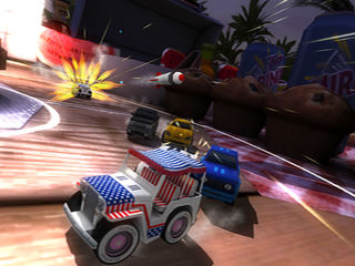 Description: Table Top Racing pits all manner of crazy vehicles, battling each other in a world of table-top race tracks and over-sized obstacles. Upgrade your cars in the garage, master both "Pick-up Weapons" and "Wheel Weapons" and explore the circuit limits and perhaps even discover secret shortcuts! With an awesome arsenal of mad-cap weapons and devious power-ups, cars and tracks are brought to life with 'AAA' production values lavished on every 60 frames per second pixel.