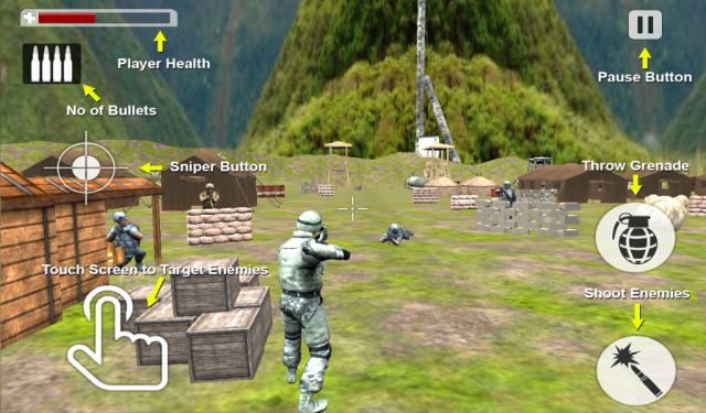 Description: As an army commando, you have been assigned a mission by army general officer to clear the base camps from enemies. Use your parachute if needed to jump into the enemy base camp. Kill the enemies hidden at different check points by using your commando skills. You can use machine gun. After killing 6 to 7 enemies, grenade is given as a reward. After successfully clearing all checkpoints, your mission is completed and you will find a map of other base camps that are occupied by enemies, and that will be your next mission.supplied by Harsha
