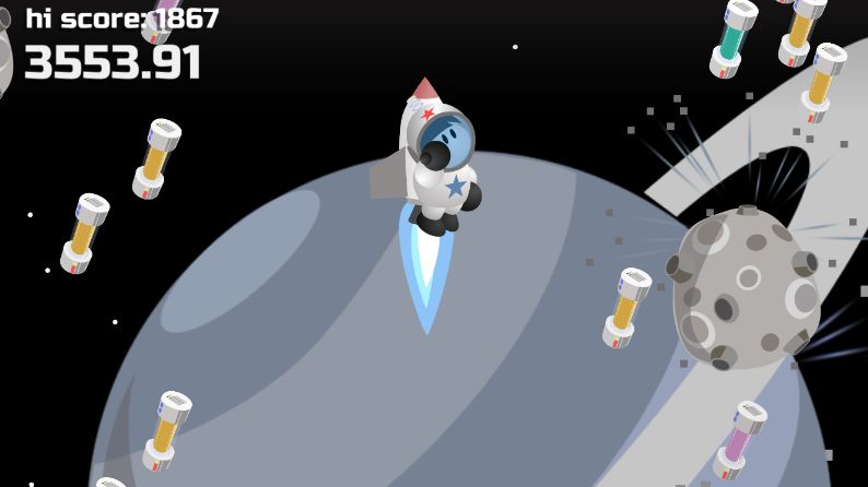 Description: Propel RocketPack Kid to new heights using speed and dexterity to fuel his ascent! Drag fuel rods to RocketPack Kid to add thrust. Orange fuel rods add a small amount of thrust. Green fuel rods add a large amount of thrust. Fuchsia fuel rods actually take away some thrust - avoid these! Watch out for asteroids! These will destroy a fuel rod on contact! Scan the skies quickly and fuel RocketPack Kid's rocket pack to launch him to new heights. Good luck!supplied by Harsha
